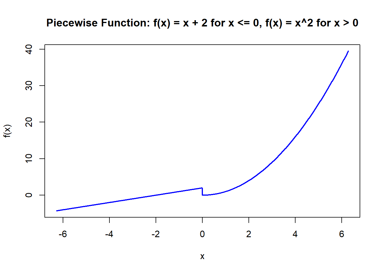 \[ f(x) = \begin{cases} x + 2, & \text{if } x \leq 0 \\ x^2, & \text{if } x > 0 \end{cases} \] In this function: